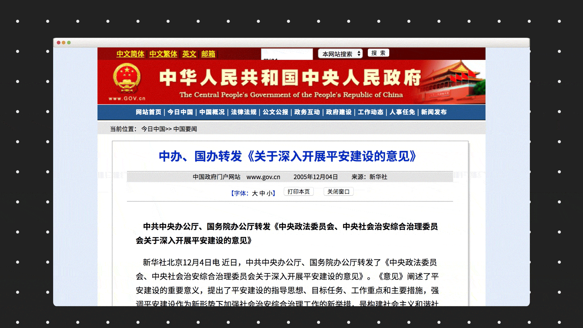 “平安城市”计划是中国食品监控行业发展的主要推力, 2005 年,国务院转发《关于深入开展平安建设的意见》。